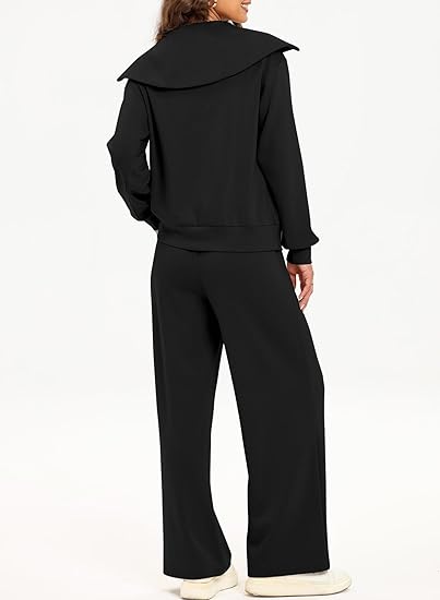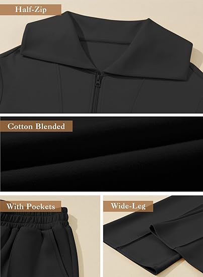 Style: women’s sweatsuit set is fashionable and functional, with a trendy half-zip top and wide-leg pants made of cozy fleece material. The quarter-zip and long sleeve design make it versatile for any weather, and the comfy fit makes it a great travel essential.
