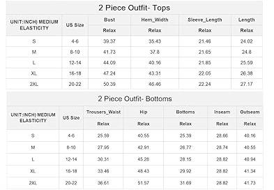 Size: These 2 Piece outfits for women come in sizes Small (US 4-6), Medium (US 8-10), Large (US 12-14), X-Large (US 16-18) and 2X-Large (US 20-22). The top and bottom pieces can be worn together as a loungewear set or separately for a cute and casual look.